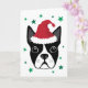 Julkort med en liten svart och vit Boston-hund med röd julhatt. Vit bakgrund med stjärnor i två gröntar. Anpassade text inuti. Underbart julkort för hundälskare och bostonborreägare!