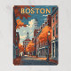 En reseaffisch i stil fångar en charmerande gatuscen i Boston, med en historisk tegel byggnad och ett sjudande träd utan orange under ett blå himmel, och "BOSTON" visas djärvt överst.