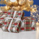 En vacker vattenfärgillustration av en Boston Terrier-hund, par med rött och grönt säsong med mönstrad bakgrund och hund bär en festlig helgdag.