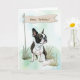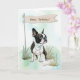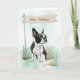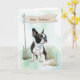 Den här fina lilla hund står stolt under en våningsbanderoll, omgiven av vattenfärgsgräs och ett ben i närheten. Boston Terrier har namnteckning toxeliknande markeringar och varningsuttryck och ger dig charm och glädje till det här leksakskortet - perfekt för någon som är smart, spunky och fullt för personlighet.
