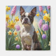 En glad hund sitter fredligt på lush grönt gräs, omgiven av färgfulla vår blommar under ett mjukt blå himmel. Den här digitala oljemålningen fångar upp ett ögonblick med uttryckliga penseldrag, varmt färg och en känsla av varm glädje.