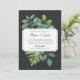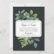 Vintagens botaniska bröllopsinbjudan visningar dina uppgifter om bröllop i bläcksvart block och kalligrafibrev, på en bakgrund med färgade löv, grenar och ferns av grönt. En rik svart bakgrund ger dramatisk elegans. Inbjudningar går tillbaka till grönten för pastellsage.