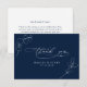 These thank you cards feature a deep navy blue background with clean white text. Fine botanical eucalyptus leaves appear in simple line art, creating a fresh and elegant look. The design offers a modern and refined style that matches any navy blue and greenery wedding theme. It provides a calm and graceful way to thank your guests.