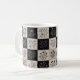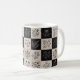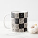 Unique coffee mug with botanical floral leather-look patchwork design. Vintage flower illustrations on stitched leather-style squares creating artisan patchwork aesthetic. Black, white, and beige rustic pattern. Perfect for nature lovers, gardeners, and rustic decor enthusiasts. Handcrafted artisan style.