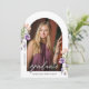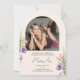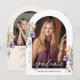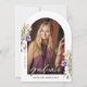 This arched graduation photo invitation is accented with peach and purple flowers and lush greenery. The elegant layout includes space for two photos and is adorned with delicate handwritten script. Personalize the back with your party details to complete the design.