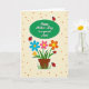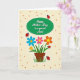 This card shows a celebratory message set inside a softly shaded green oval near the top, with the lettering in a darker green for easy contrast. Below it, a small brown flowerpot sits centered, holding a friendly bouquet that feels like it’s been arranged with care for someone special ❤️. The blossoms are simple and symmetrical, with bright blue, pink, and warm orange petals circling sunny yellow centers, giving the scene a sweet, companionable energy. Green stems and broad leaves spread outward like open arms, adding to the sense of closeness and gentle affection. A light cream background is sprinkled with tiny reddish-brown dots, creating a cozy, textured look without feeling busy. Scattered around the flowers are a few red, spotty little insects with thin antennae, one resting calmly on a leaf and another hovering near the message as if drawn to it 🌼. Soft shading on the pot, the oval, and the tiny insects adds a slight sense of depth, and the red insects’ dark spots stand out clearly against their bright shells.
