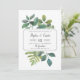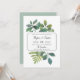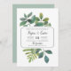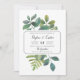 Vintagens botaniska bröllopsinbjudan visningar dina bröllop-uppgifter som är unikt ordnade i bläcksvart block och kalligrafibrev, på en bakgrund av målad grönt vattenfärgsfärg löv, grenar, ferns och löv. Inbjudningar går tillbaka till solid sage grönt.