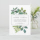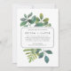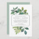 Vintagens botaniska bröllopsinbjudan visningar dina uppgifter om bröllop i moderna bläckhaltiga, svarta bokstäver, på en bakgrund av målade löv för grönt, grenar och oron.