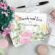 Skicka ett speciellt tackkort med en apelsin-, persika-, rosa- och gul botanisk design. Detta trädgårdsros-tackkort är super charmigt med matchande inbjudningar, kuvert och partydekorationer. Akvarellrosor är prydda med en spray av silver Dollar eukalyptusblad. Dessa akvarellblommiga tackkort kan enkelt anpassas efter din examensfest, födelsedagsfest eller bröllop.