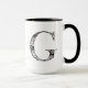 Skräddarsy denna Räcka-märkte G-mugg med ditt namn. Ursprungligen skapat in skriva och bläck. Detta brevG är från ett av min beställnings- alfabet. Märka G, alfabetet, calligraphyen, typografi, monogramen, blommor - svartvit bläckkonstprodukt