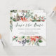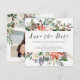 Dessa eleganta julbröllopskort med spara datum-funktion har rustika vattenfärgblommor med kottar, grenar, bär, blad och vita rosor och vacker kalligrafi. Ert personliga foto visas på baksidan med fler blommor.