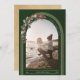 Modernt julkort med foto. Trendig rundad valvdesign med blekgul regnbågsbåge som ramar in ditt foto. Accenterad med vattenfärg vinterbotanisk bladverk på mörkgrön bakgrund. Lätt att anpassa med din text och foto