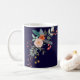 En färgrik sprej av grafiska botaniska blommor dekorerar denna kaffemugg, och den kan personifieras med tre monograminitialer. Bakgrunden är en marinblå rik.