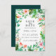 Vackra akvarell botaniska öblommor och löv ram, Bröllop Spara datum-kort. Baksidan av kortet har en solid djup ocean teal färg.