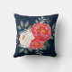 Denna botanisk-inspirerade dekorativ kudde presenterar den röda vibrerande vattenfärgen och elfenbenblommor på djärv marinblå bakgrund