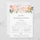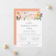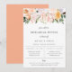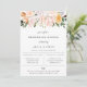 Elegant akvarell botanisk trädgård blomsterarrangemang, inbjudan till repetition middag. Chic och modern typsnittsdesign med rosa, persika, lila, orange och vita blommor. Baksidan av kortet har enfärgad persikofärg.
