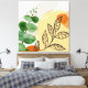 Botaniska boho-konstruktioner med grönt, orange och beige färg och vattenfärgsinslag.