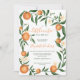 Citrusfrukter med liten orange, små barnduschinbjudan med söt orangar, citrusfrukter med klementinursprung, grönt grenar och löv med vita blommor och ett modernt penselteckensnitt. perfekt könsneutral babydusch för vinter-, vår- och sommarcitrussäsongen! Med söt citrus clementine botanical mönster längst bak.