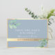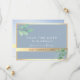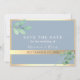 Enkel inbjudan till elegant, botaniskt guld och dammigt blått bröllop spara datum, med foto på baksidan, vattenfärgen eukalyptus greenery och modernt kalligrafi-skript.