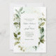 Det här trendiget och vackra botaniska bröllopsinbjudningar har lush, löv av vattenfärgen grönt och accenter av elegant faux guld. Det finns också modern skriptkalligrafi och klassisk text, och subtil grönt vattencolor stänk dekorerar den vita bakgrunden.