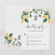 Utformningen har en texturerad bakgrund, vattenfärgscitroner med handmålade gröna och vita blommor av blommar. Den här bröllopet OSA har även en calligraphy-typograferingslayout som består av kursivt serif typsnitt. Anpassa helt enkelt osan för dina gäster så att de kan svara på ett vänligt sätt senast. Matchande bröllop-kontorsmaterial finns tillgängligt.