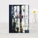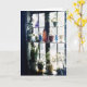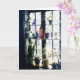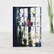 Ett underbart fönster med gammalt färgat flaskor med växtartkort.