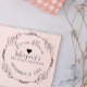 Lägg till ditt eget märke i din möhippa med hjälp av detta vackra gummi frimärke. Den här möhippan sparar datumet frimärke har en botanisk krans i hand plockade, "kärlek i blomning" i en elegant skriftlig kalligrafi, ett fet hjärta, ditt namn och datum.