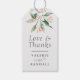 Lägg till en enkel elegant-favärde-tagg till gåvor och favoriter för gäster från bröllop, familjemedlemmar eller brudens sida. Den här fina designen har en enda sprit av skogsgrej med små persikoknoppar av färgad. Textmallen innehåller tacktext och namnen för bruden och brudgummen. Personlig med önskad text.