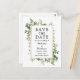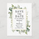 Modern Elegant Watercolor botanical Grey Save Date Bröllop annons Postcard innehåller eucalyptus löv och botaniskt grönt löv på guld ram.