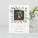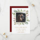 Denna bröllopsfoto save the date-inbjudan har målad akvarell eukalyptus, gröna blad, röda bär, tallgrenar och en falsk guld fyrkantig ram med röd bakgrund på baksidan. För mer avancerad anpassning av denna design, klicka på "Anpassa ytterligare"-länken. Matchande artiklar finns också tillgängliga.