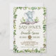 Babyduschinbjudan med illustration av gröntar och löv i rustiska vattenfärger och en sympatisk elefant från baby