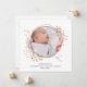 Elegantens foto med botaniska ram av koppar ro guld och klassiska bokstäver. Fotomallen är utformad så att du kan lägga till bilderna längst fram och bakåt. Båda är ramade med en cirkel med flera ring och bran ritad med löv, knop, blomma i blomma och stänk. En framtagbar design som introducerar nyfödd bebis för vänner och familj. Du kan lägga till baby namn och födelsestatus på ena sidan och ett personlig till den andra.