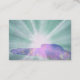 En eterisk modern metafysisk konstnärlig horisontalvisitkort med en himmelsk universumhandflatan som vänder mot upp och utstrålar härlig läka energi. Kortet och räcker har starka toner av cyan, krickan och lilor.