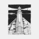 En svart och vit illustration av fyr i slutet av boulderbanken i Nelson i Nya Zeeland. Denna fyr ligger i närheten och har en åkerö i bakgrunden.