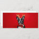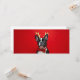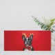 Bouledogue Français noir et blanc au nœud papillon rouge et des bois de renne dorés, sur un fond rouge. Le style est amusant et décalé.