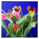 En bukett med olika tulpaner med blå bakgrund. I bilder visas alla färger i vår.