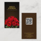 Det här affärskortet för blommigt av elegant är perfekt för händelseblommor och blomsterkonstruktörer. Den har en djärv bukett av röd ros på en mörk med en brinnande bakgrund för ett klassligt, högklassigt utseende. Underbar för bröllop, speciella evenemang, blommigt av företag och blommigtar. Innehåller utrymme för ditt namn, kontaktinformation och en QR-kod som arbets- eller bokningssidan. Fullt anpassade för att passa ditt varumärke. Det foto som används genereras med Adobe Firefly, designat för säker använda, och baseras på Adobes licensierade innehåll. Alternativt kan du ersätta den med en egen bild för anpassning av fullt.