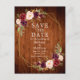 Elegant akvarell Bourgogne Blommig Spara Datum Bröllopsinbjudan Postkort inkluderar bourgogne rosor, rosa rosor, röda rosor och grönska på en guld geometrisk ram. Rustikt Land Trä.