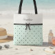 Make a statement with a tote that radiates boutique charm and personalized elegance. This custom tote bag features a sophisticated two-tone design, pairing a crisp, cool-toned porcelain top with a refreshing mint green polka dot base. The centerpiece is a delicate, sheer black bow anchored by a classic ribbon that separates the color-blocked sections. Personalized with the name "Seraphina" in the timeless script, this bag strikes the perfect balance between vintage flair and modern chic. Whether you’re heading to a bridal brunch, a weekend market, or looking for the perfect personalized gift for a style-conscious friend, this tote offers a premium look that stands out. The high-contrast black accents against the pastel palette ensure the design remains sharp and fashionable for any season. Part of the Resort-Ready 2026 Collection—pair with matching accessories for a complete look.