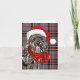 En söt Bouvier des Flandres hund på en röd och grå randig julduk för högtiderna, i en rolig mindre än genomsnittet och vikt firande hälsning.
