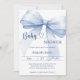 An elegant white background, decorated with a large blue bow. Personalize and add a name and party details.