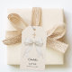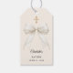 Soft ivory colored background. A large bow with pearls and a golden cross as decoration. Personalize and add her name and the date: