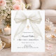 White background, decorated with a large ivory colored bow with pearls and a golden cross. Personalize and add a name and details details.