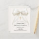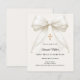 Celebrate your daughter's milestone with this elegant First Holy Communion invitation. This design features a stunning, oversized ivory silk bow adorned with delicate pearl strands and a central ornate gold cross. It is the perfect choice for a traditional Catholic ceremony or a sophisticated religious celebration for a young girl.
