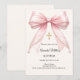 A warm ivory background, decorated with a large pink colored bow with pearls and a golden cross. Personalize and add a name and details details.