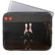 Ett laptop sleeve med ett foto på två bowling stift som ska bli nedslagen av en bowlingboll.