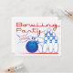 Här är en färglös röd och blå återgivning för bowling party. Design har en bowlingstift som rullar i tio stift. Det här kommer att vara en strejka när dina gäster får inbjudningarna. Leta efter knappar, skjortor och andra tillbehör som ska läggas till i födelsedagsfestens bowlingtema. Skapa priser eller artiklar för en påse.