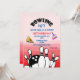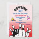 En födelsedagsinbjudan med bowlingtema. Illustrationer som ingår i designen inkluderar en bit pizza, en bit tårta med ett ljus på, och en stor bild av några bowlingkäglor och en bowlingboll. Anpassa med dina festdetaljer.