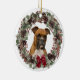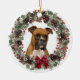 På framsidan av denna Helgdag är en bild av en vacker brun och vit Boxer-hund som är framtagen av en söt vattenfärgad gräs cone och berry Helgdag Wandeans. Hund är i mitten på en vit bakgrund. En glansig röd buske ge lite av julens gnistra till andedräkten. Baksidan av dekoratet har samma andedräkt med anpassningsbarnas text i rött och mörk grönt.