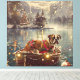Segla in i höckelsäsongens magi med denna vackert detaljerade illustration, som visar en stolt hund som sitter i en festligt dekorerad båt och glider över en lugn julinsjö. De gnistrande ljusen från närliggande tallar reflekteras i vattnet och sprider ett varmt, festligt sken som förstärker den mysiga stämningen. Julgranskulor hänger från båtens sidor medan lysande lyktor lyser vägen och skapar en scen som fångar den sanna känslan av julens värme och glädje. Detta nostalgiska konstverk för med sig en touch av högtidsstämning till alla utrymmen, perfekt för dem som värdesätter årstidsandan.